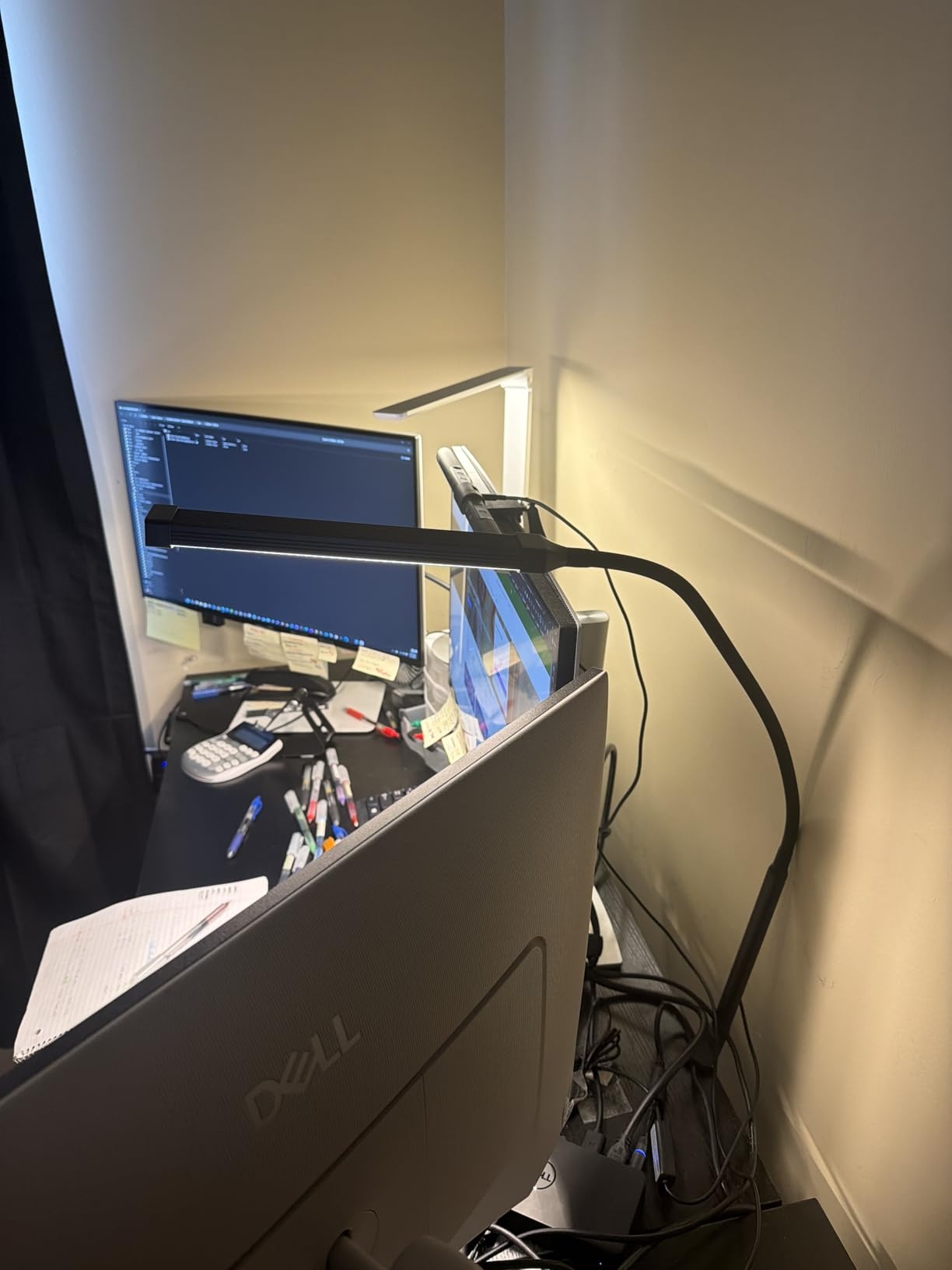 Double-head black LED desk lamp with clamp provides wide coverage – one head for monitor, one for desk. 3 modes and 10 brightness levels. Adjustable goose-necks position light precisely. Sturdy clamp and metal build. Great for multitasking or large workspaces – enhanced visibility and comfort.